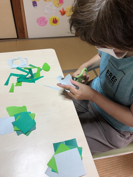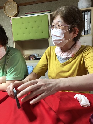まずは緑の折り紙を切って葉っぱ作りです。 一つ見本を差し上げると、見本を次の折り紙にあてながら切っていきます。 全て同じ形に切るのは難しいですが少しずつ違う形のものができるのも味があって良い感じです。 |