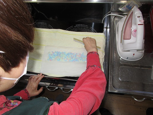 綺麗に並んだら、クッキングシートを折ってはさみ、 アイロンでギューッとくっつけていきます。 後でバラバラにならないように… でもペラペラにもなってしまわないように… 程よい時間と程よい力加減で… 形よく仕上がったでしょうか??? |