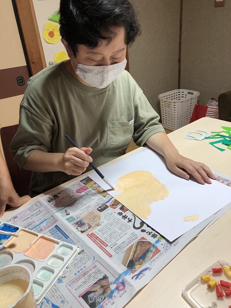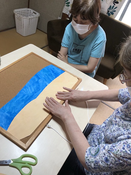 | 次は背景です。 南国の穏やかな海岸線をイメージして、 どんな色合いが良いですか?と、 職員と利用者さんで色を考えながら塗っていきます。 この季節、絵の具を塗った画用紙を外に出すと 瞬く間に乾いてしまいました。 |