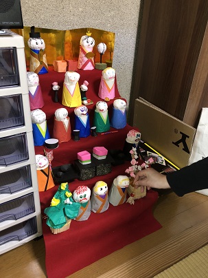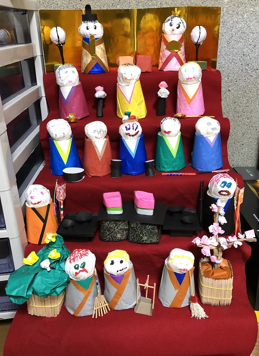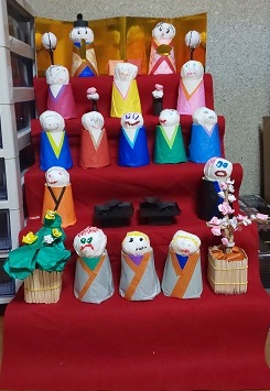 まずは一番上の内裏雛から、 五段目の仕丁と呼ばれる遣いの方まで みなさんで手分けして作っていきます。 |