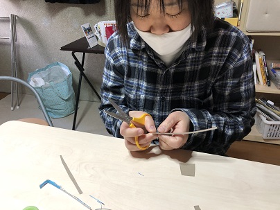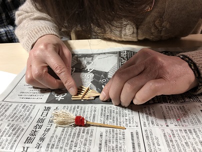 ほうきの大きさを参考にして熊手を作ります。 切った竹串をボンドで付けて、形を整えます。 細かい作業にも集中して取り組んでおられました。 |