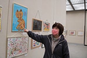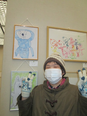 | ご自身の作品の前で笑顔のピース! 頑張って描いた絵がこうやって飾られていることに本当に嬉しそうなご様子でした。 |