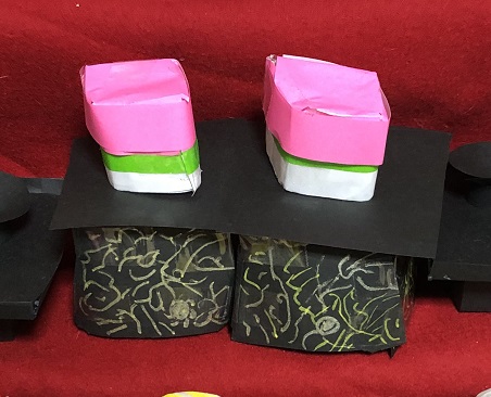 人形が出来上がると、雪洞、高坏、 お膳や、右近の橘、左近の桜など、 大きな飾りを順に作って行きました。 |