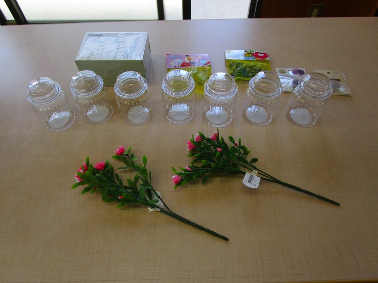 | 材料は造花とガラス瓶と吸水スポンジがメインで、他にもビー玉やおはじきなど、皆さん思い思いに装飾されました。 | |