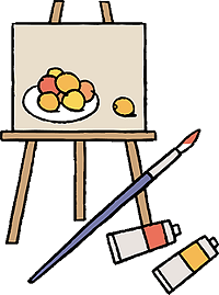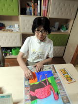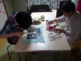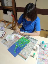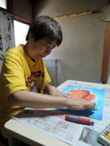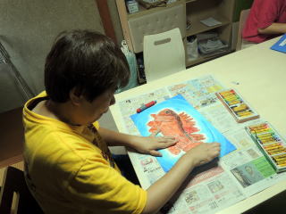 美子 様の作品が高く評価された実績もあり、どれみふぁ荘の面々も、負けてはいられない!と、意気揚々と作品作りに精を出されています。真っ白なキャンパスに思い思いの絵を描き、クレパスで着色していきます。 な〜んだ、クレパスか・・・と、思うなかるべからず!クレパスで塗った部分を指の腹でこすって仕上げを施すと、油絵のような仕上がりになります。こういった手間を惜しまず加えた作品は、非常に奥深いモノとなり、これぞ芸術!!と言える作品に仕上がりました。 |