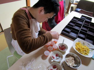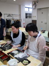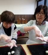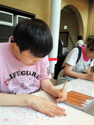工場見学が終わり体験道場へ戻ると、先ほど蒸していた生地が出来上がっていました。その生地を使い、3つのオリジナル八つ橋を作っていきます。毎週木曜日に調理実習を行なっているどれみふぁ荘のご利用者ですが、その経験が活かされてか、手際よく八つ橋を作っておられました。ご利用者の中には抹茶にこだわり、オリジナルの抹茶八つ橋を作られた方や、生地をハート型にした”愛の八つ橋”を作る方もおられ、みなさんのオリジナリティが感じられる体験実習となりました。