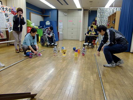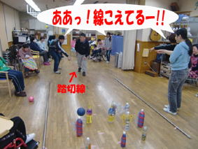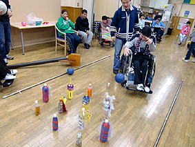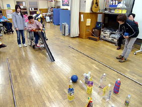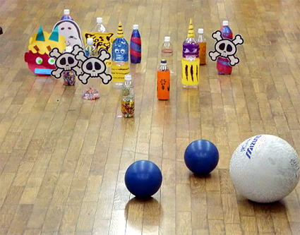 は、利用者さんの手作り。このペットボトルにボールを当て、ペットボトルを倒すゲー