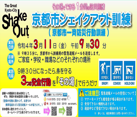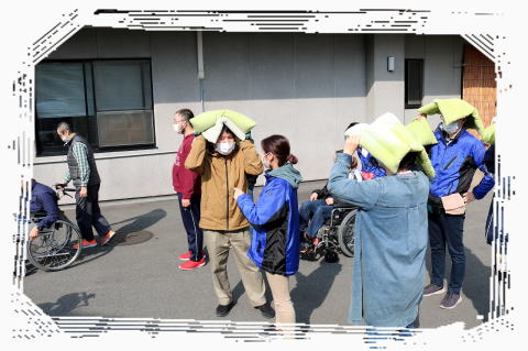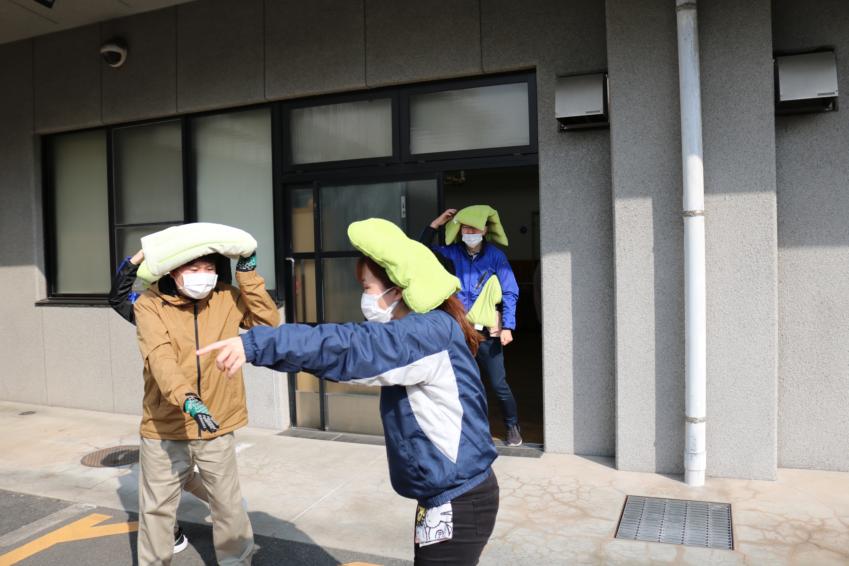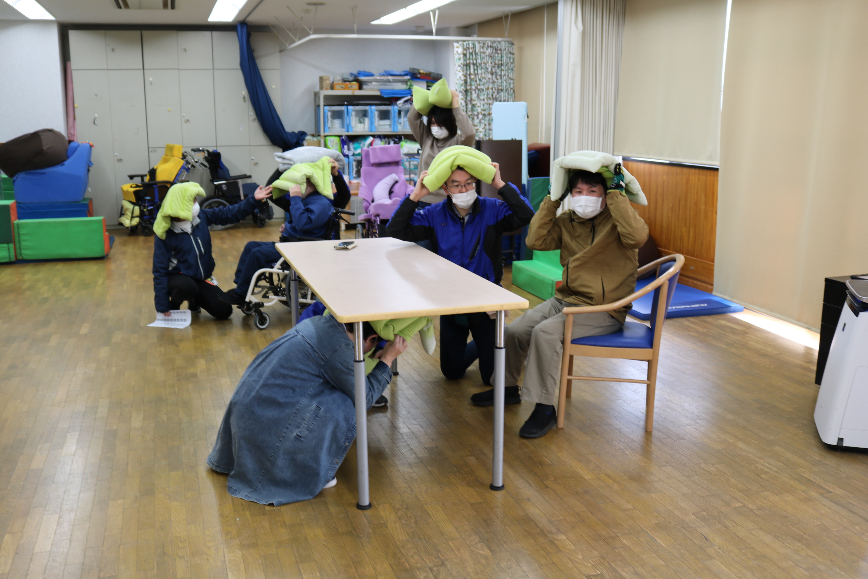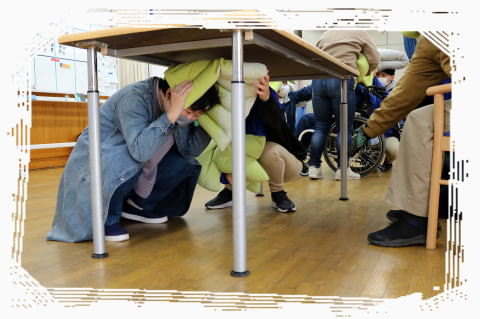 机の下に隠れること!なるべく中央に集まること!を