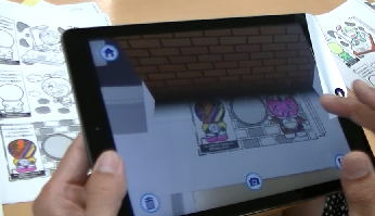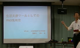 演習では、実際にipadを使って、ipadのさまざまな機能について知ることができました。 中でも印象に残ったものが、3Dバーチャル体験ができる機能で、専用ソフトとipadのカメラ機能を使用することで、平面上にあるイラストが浮き上がってくるというモノ。しかも、その浮き上がったイラストが画面の中で動くのです!これには、参加した職員も、驚きを隠せません。会場内のあちらこちらで、「わぁー」とか、「おおっ!」と言う声が聴かれ、しばし童心に返ったような気分になりました。 |