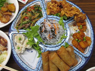 鶏の唐揚げ・チャーハン・春巻き・・・美味しそうな食材がところ狭しとテーブル