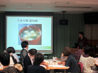 咀嚼(=噛む)・嚥下(=飲み込み)機能のメカニズムと、機能低下で起こりうるリスク、更に、嚥下機能が低下した場合を想定した疑似体験等を、楽しく、解りやすく、地域の方も含めた講習会を、平成28年10月13日(木)に、当センターにて開催致しました。今回の講習会を企画したメディケア・リハビリ訪問看護ステーション京都(京都市伏見区桃山)のスタッフの方々が、嚥下機能についての講義をされ、伏見デイが会場の提供と、設備等の準備を行なう、合同リハビリテーション講習会として開催しました。