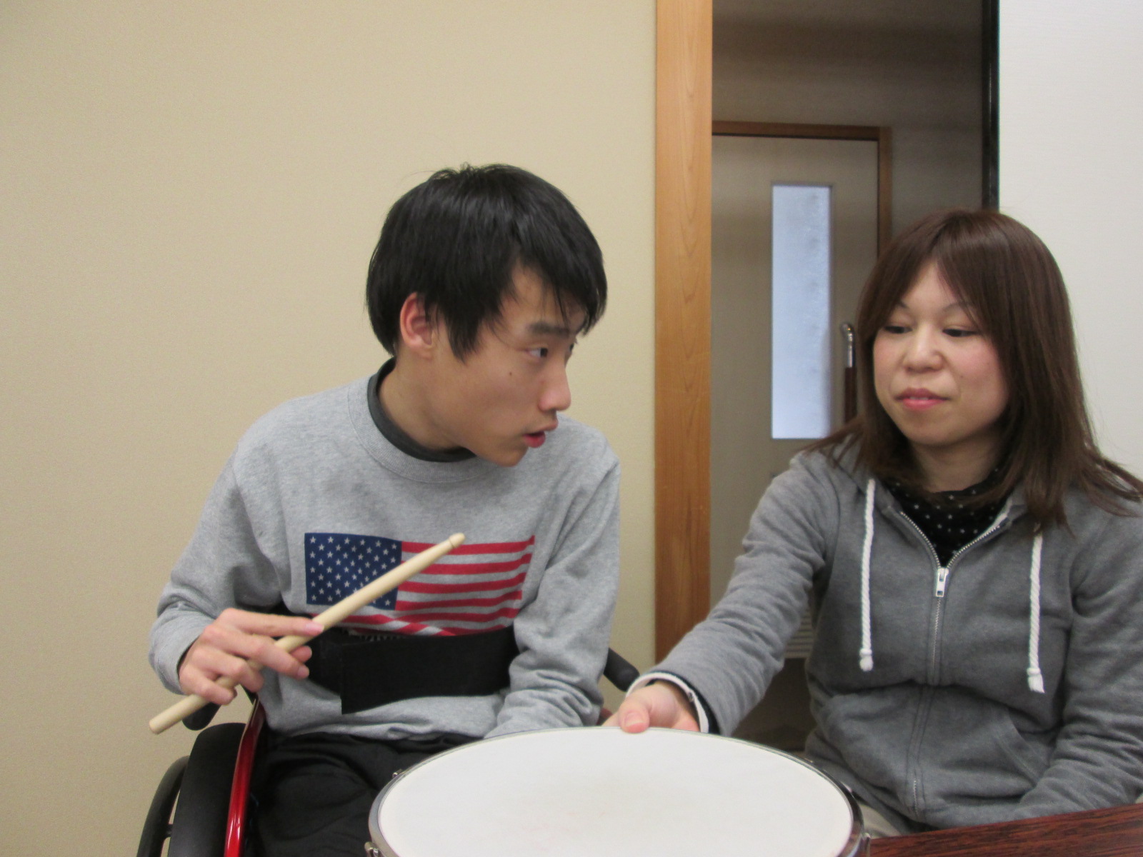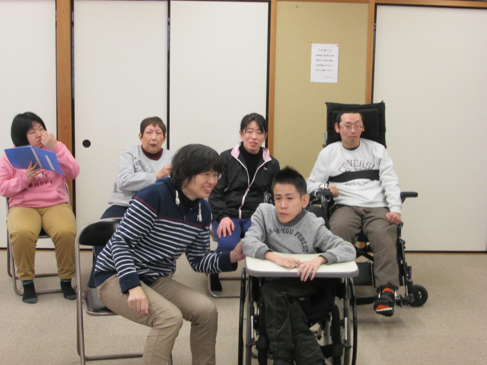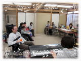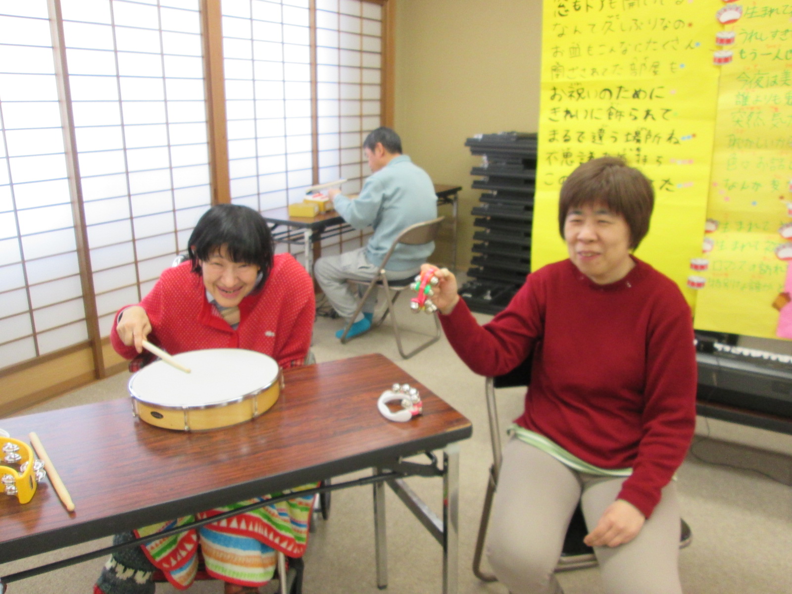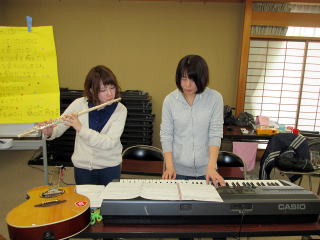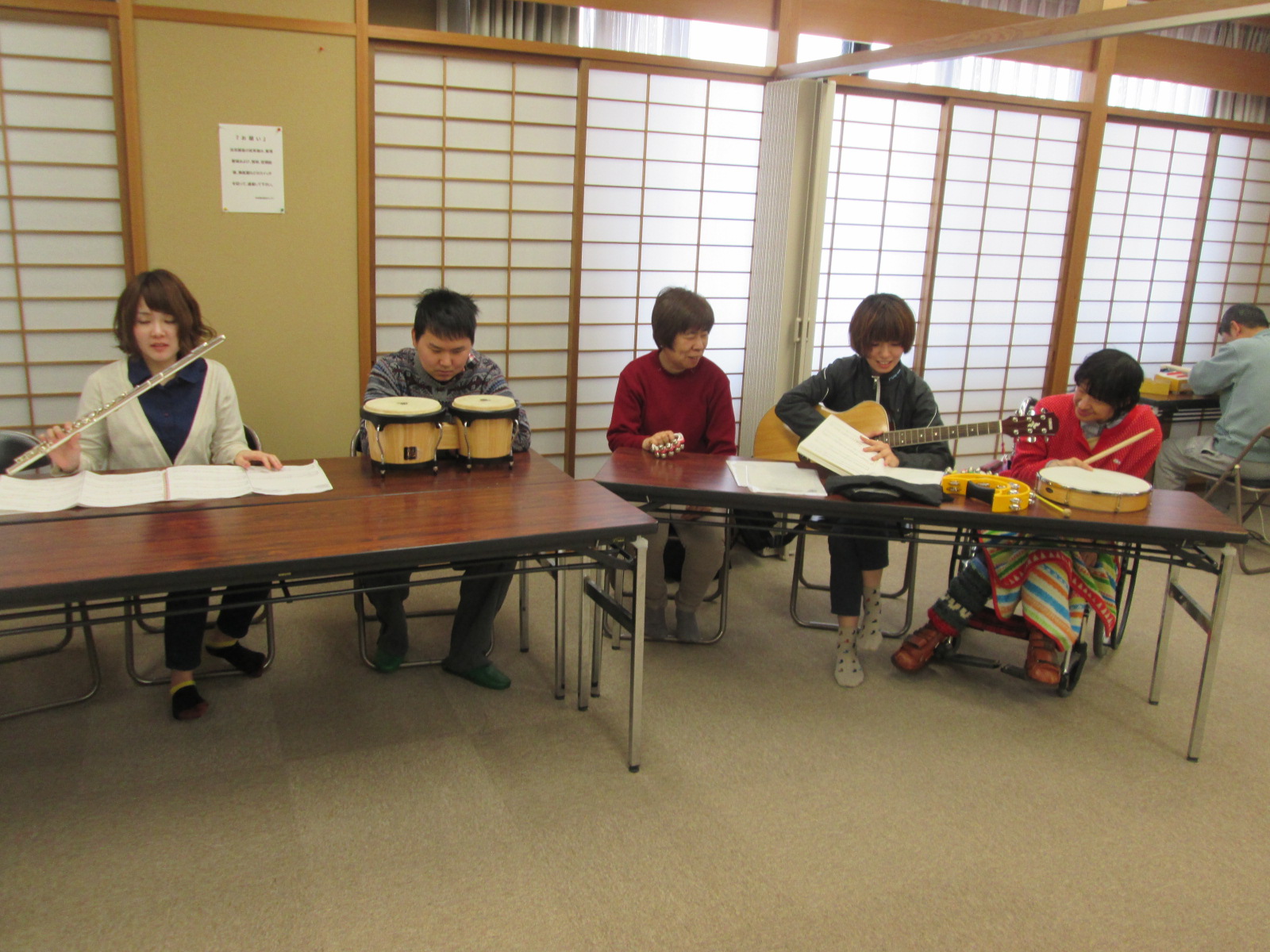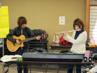 そもそもこの計画が持ち上がったのは、昨年末に催された忘年会で、職員や利用者様と森さんとの会話の中で、演奏会をしよう。と、話がまとまり、それなら、森さんが得意とするフルート演奏会をしませんか。という話になり、今回の演奏会が実現したのです。この思いがけない演奏会の話には、利用者様や職員も大喜び!せっかく演奏して頂くなら、利用者様も演奏に参加できるような催しにしたいということになり、この日に向けて、利用者様も活動の時間などに楽器に練習を行っていました。![]() |