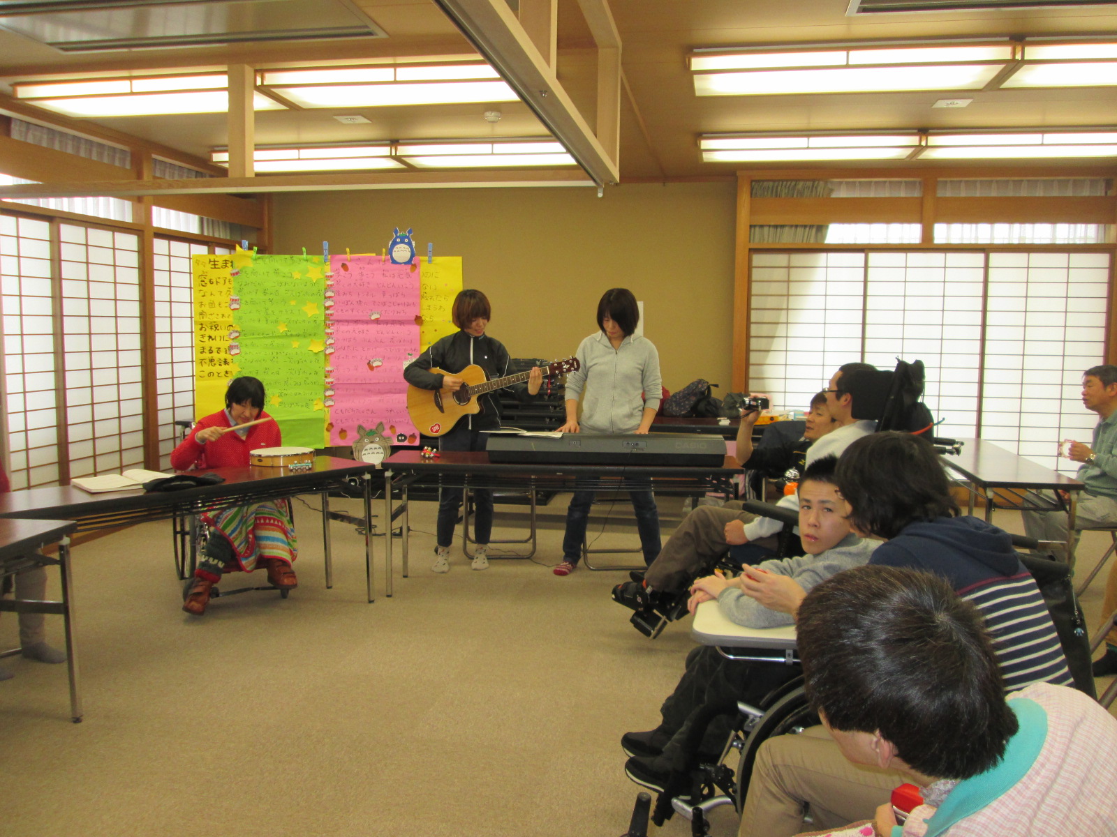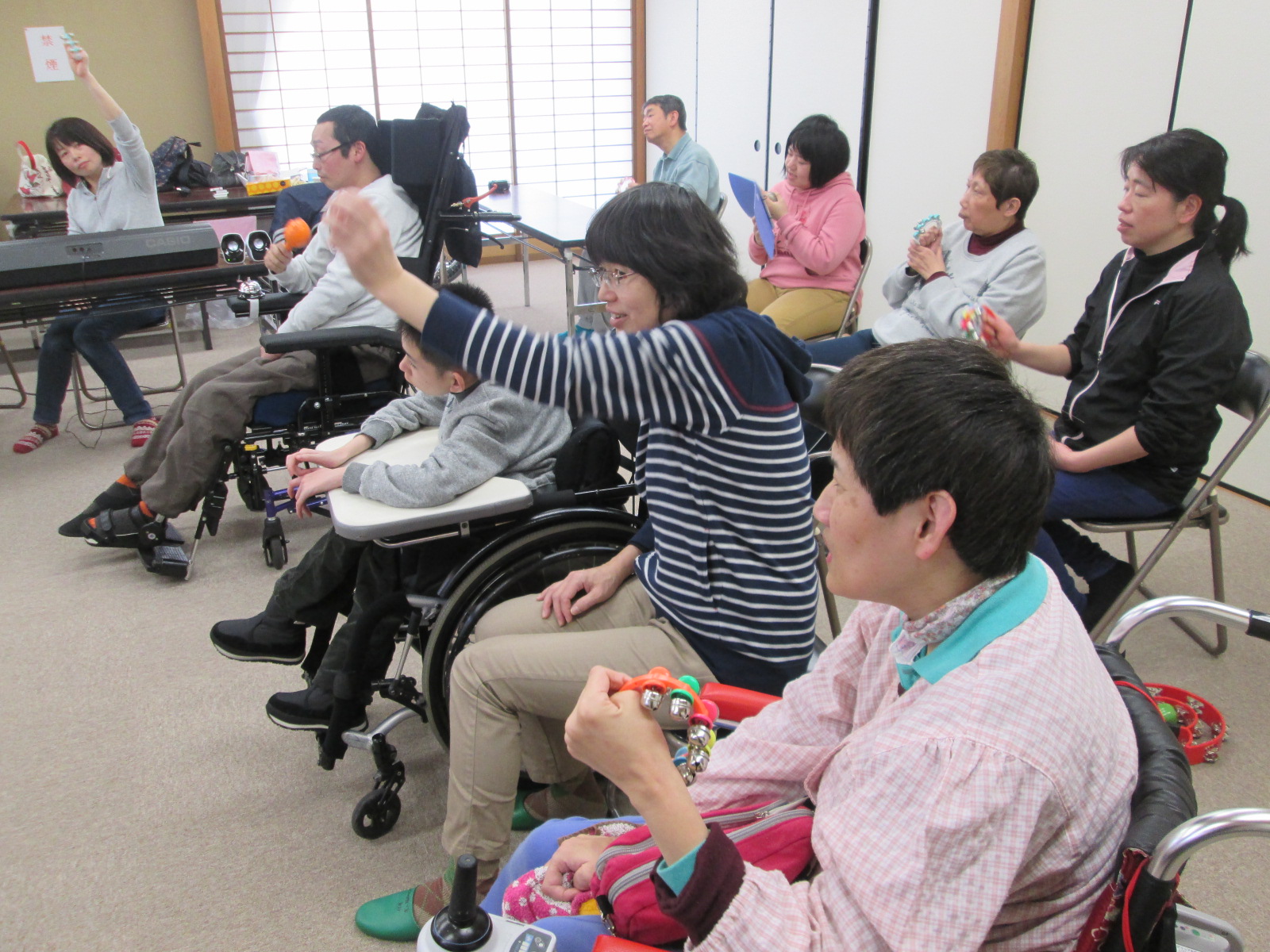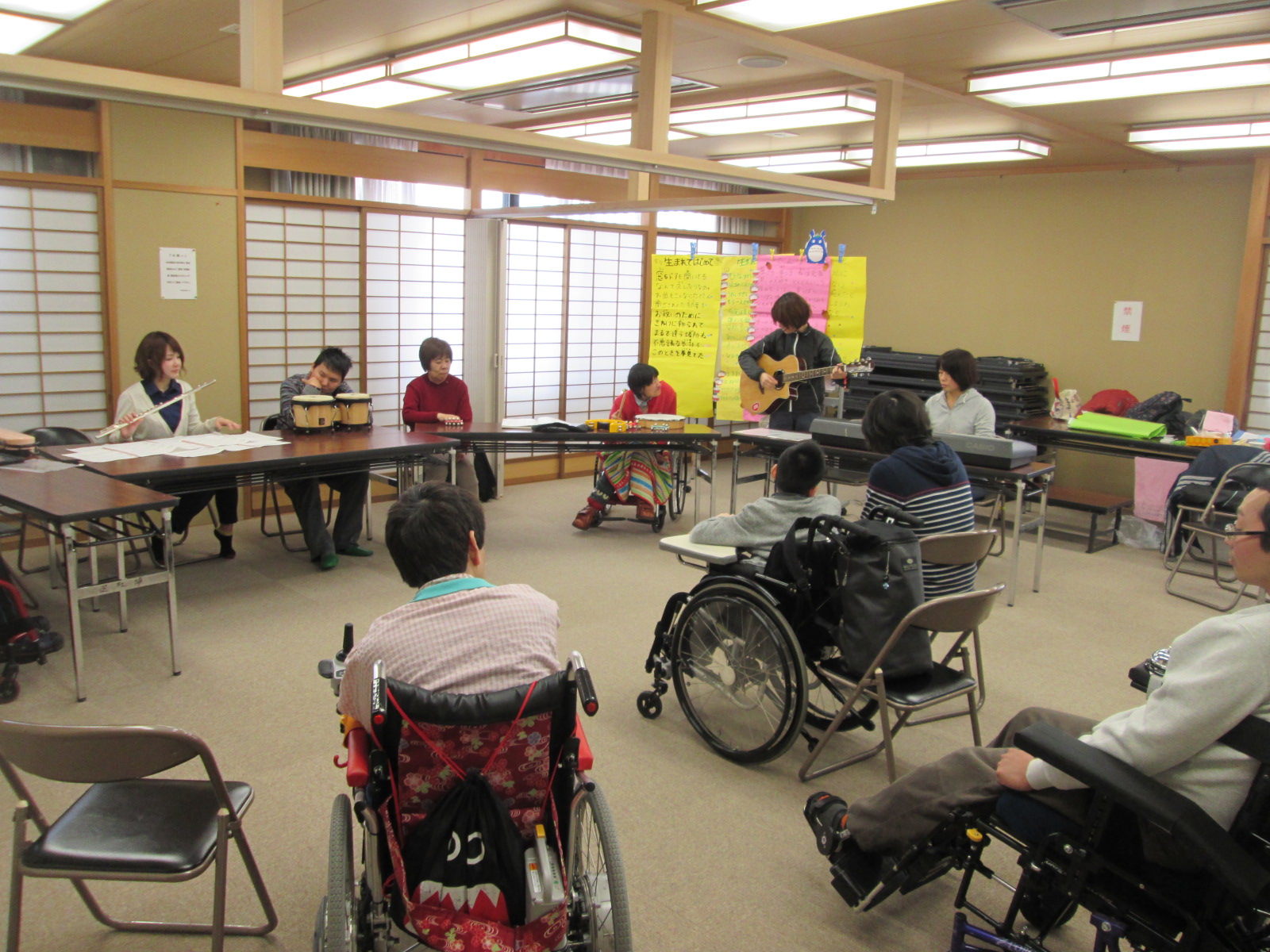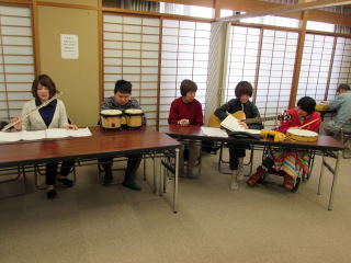 演奏会は12日の午後から、活動の一環として行いました。演奏会に参加された利用者様もこのイベントを心待ちにされており、楽器を片手に、会場へと足を運びました。そして、午後1時30分から演奏会が始まりました。今回、演奏して頂いた曲目は、@さんぽ(映画:となりのトトロ主題歌)A上を向いて歩こう(坂本九:東芝レコード[現:東芝EMI])Bうまれてはじめて(映画:アナと雪の女王挿入歌)などを披露して頂きました。これらの曲は、利用者様にも馴染みのある曲で、日頃の音楽(活動)の時間に、唄ったり、演奏したりしていた曲なので、森さんのフルート演奏に併せて、鈴や太鼓でリズムをとり、合奏を楽しみました。この日に向けて、利用者様同士で合奏練習をした甲斐もあってか、息のあった大変美しい音色となり、これには、森さんもビックリ!当日は素晴らしい演奏会となりました。![]() |
