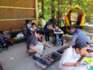 今年は、5月25日と、6月4日・5日・9日の4班にに分かれて、大森キャンプ場にバーベキューに出かけました。 大森キャンプ場は、京都市北区(旧京北町)大森にあるキャンプ場で、市内からも近く、自然を満喫できるキャンプ場とあって、京都府内はもちろん、関西圏でも人気が高いキャンプ場です。 当日は施設を午前10時30分頃に出発、京都市内の渋滞が懸念されましたが、比較的スムーズに抜けることができ、午前11時40分頃には現地に到着しました。 |