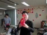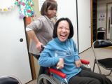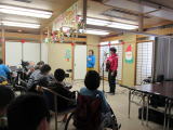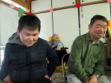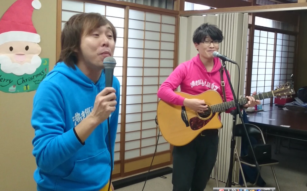 第2日目は12月18日(金)に実施し、午前は、前回に引き続き、1年を振り返ってのスライド上映を行いました。 午後からは、関西を中心に活動をされているデュオユニット、「沸きだせ!温泉ズ」のお二人が来所され、楽しく元気のでる曲を中心に、ミニ・ライブを行って頂きました。ライブでは、曲と曲の合間にみせるお二人のトークが面白く、さながら”漫才師”と言ったような雰囲気は、さすが関西人!クリスマスソングや、オリジナルソング”ぬんぬんぱ”や”じゃぱ〜ん!JAPAN”、そして彼らの代表曲”かお”などが披露され、みんなで大合唱しました。 |