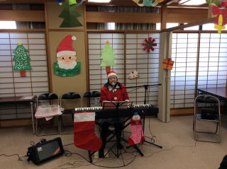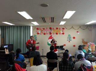 | 忘年会最終日は、会場を第1会議室に移しての開催となりました。巷では”クリスマス・イブ”となった今日、心なしか、気分は盛り上がっています。午後から開催されたミニ・ライブでは、”Waoya”さんにお越し頂き、クリスマスソングや、利用者様に馴染みのある歌を披露して頂きました。余談ですが、このお二人は、音楽を通じて心身の健康と機能訓練を兼ねた「音楽療法」に取り組まれており、各福祉施設を訪問したり、音楽と福祉というテーマで地元のラジオ番組でパーソナリティを務めたりされています。そういった活動をされている為か、ライブでも、利用者様の心に届く歌で、参加された利用者様も楽しまれ、最終日にふさわしい催しとなりました。 | ![]() |