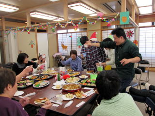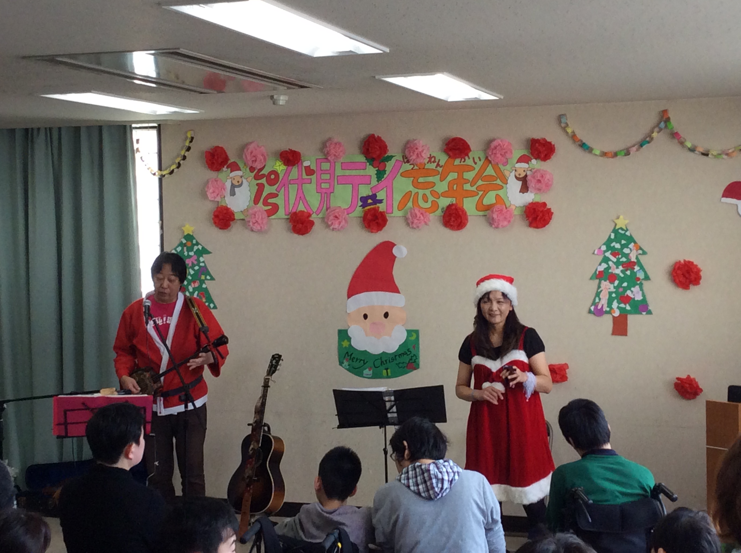 今年の冬は、例年に比べ暖かく、年末押し迫った12月でも、気温が10℃台を維持し、冬らしさを感じさせない気候となりました。「本当に年末なの?」と、感じさせる12月ですが、伏見デイで恒例となりました”忘年会”を催しました。今年は14日と18日、そして24日の3日間で、それぞれの日に分かれて開催しました。 今年のプログラムは、午前にスライドを使って、今年一年を振り返りました。昼食はWITH YOUさんにお願いした豪華なオードブルで舌鼓をうち、午後からは、演者様をお招きし、歌の披露、プレゼント付きビンゴゲームなど、楽しい催しが盛りだくさんの一日となりました。 |
