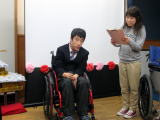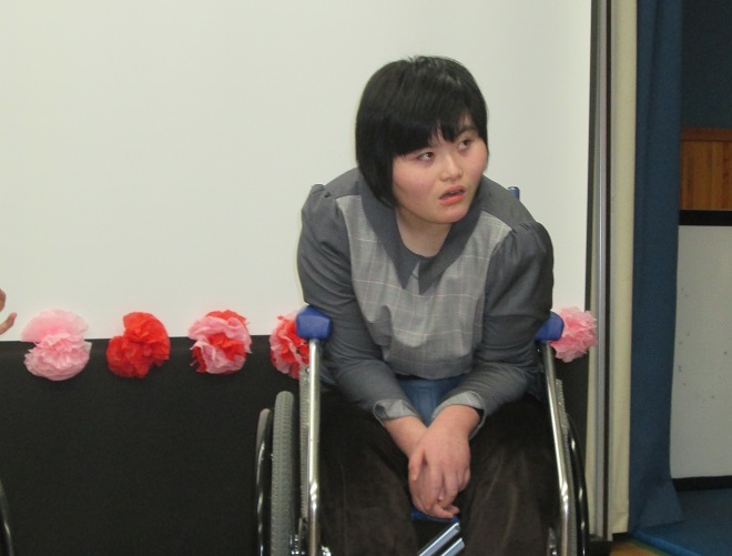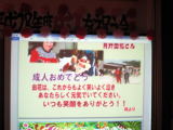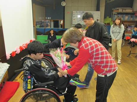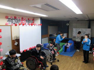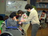 最後に、今年成人を迎えられる3名の利用者様一人ひとりに花束が贈呈され、全員でお祝いの歌を唄って、和やかなうちに会が終了しました。 |