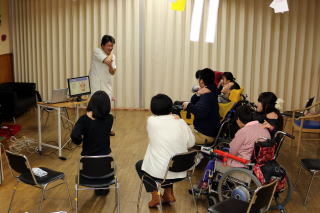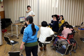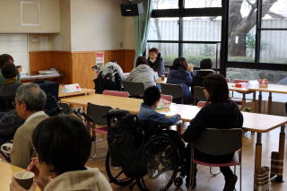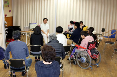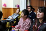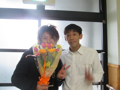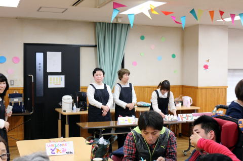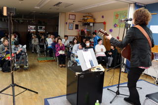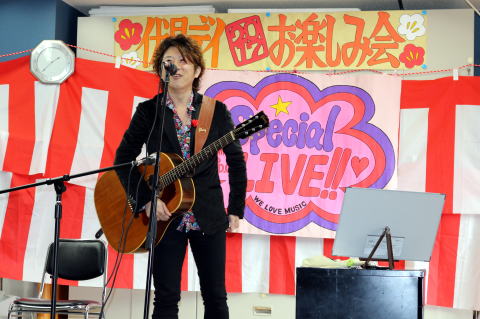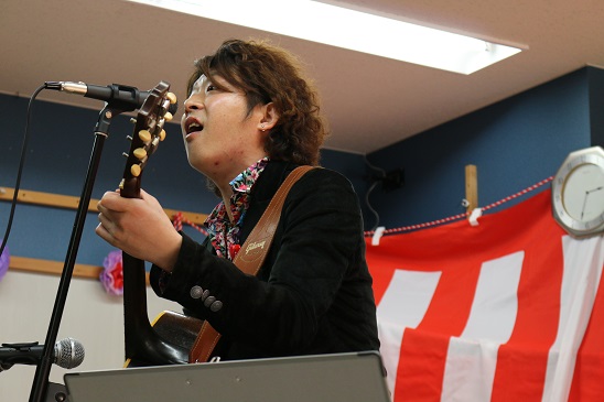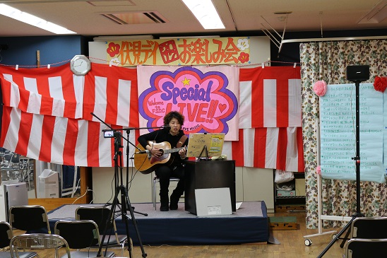 今年度最後のビッグイベント、”おたのしみ会”が2月18日の土曜日に、当施設にて行われました。今年の出演者は、シンガーソングライターの『古賀 直樹』さん。前日には倉敷(岡山県)でライブがあった古賀さんですが、この日の為に、倉敷から新幹線に飛び乗り、施設に駆けつけて頂きました。 当日は、ご利用者とご家族や、ヘルパーの方々、また地域の皆様など、多数のご参加を頂き、開演前から、会場のデイルームは満席状態。午後1時30分、時任所長の挨拶でイベントがスタートすると、少々、緊張気味の古賀さんでしたが、熱い拍手で迎えると、次第に緊張がほぐれたと、後にご本人が語られていました。そして1曲目は、ご自身の代表曲、”何も言わず海を見よう”を唄われました。唄い終えた頃には、観客席とステージが一体となり、全員がライブに参加しているというような、生演奏独特の臨場感がありました。 ![]() |