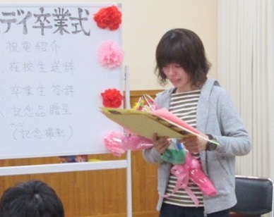 式では、所長からの祝辞や卒業証書の授与、在校生(デイご利用者)からの送辞など、その内容はまさに”卒業式”!更に美濃さんと親交の深い他事業所の職員からの祝電なるものまで披露されました。