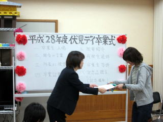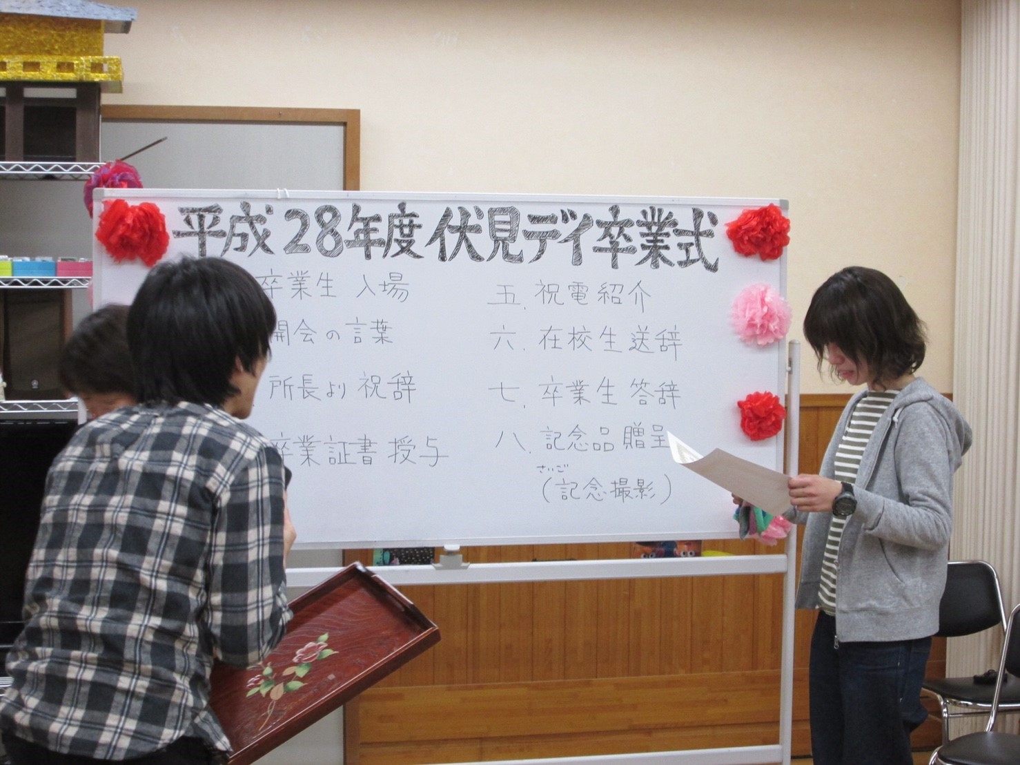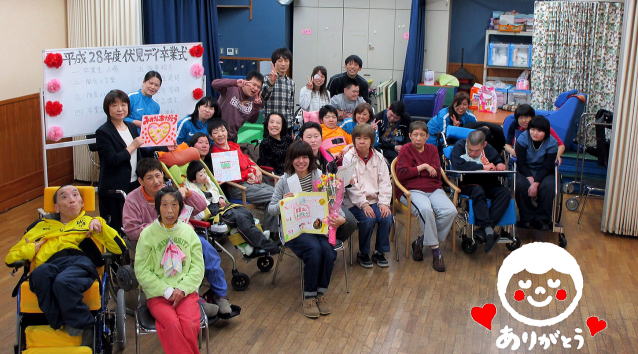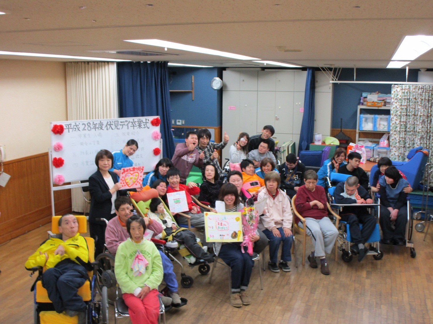 伏見デイで6年間、在職された功績を讃え、伏見デイでは、利用者様と職員とで催したお別れ会『平成28年度 伏見デイ卒業式』を厳かに挙行しました。