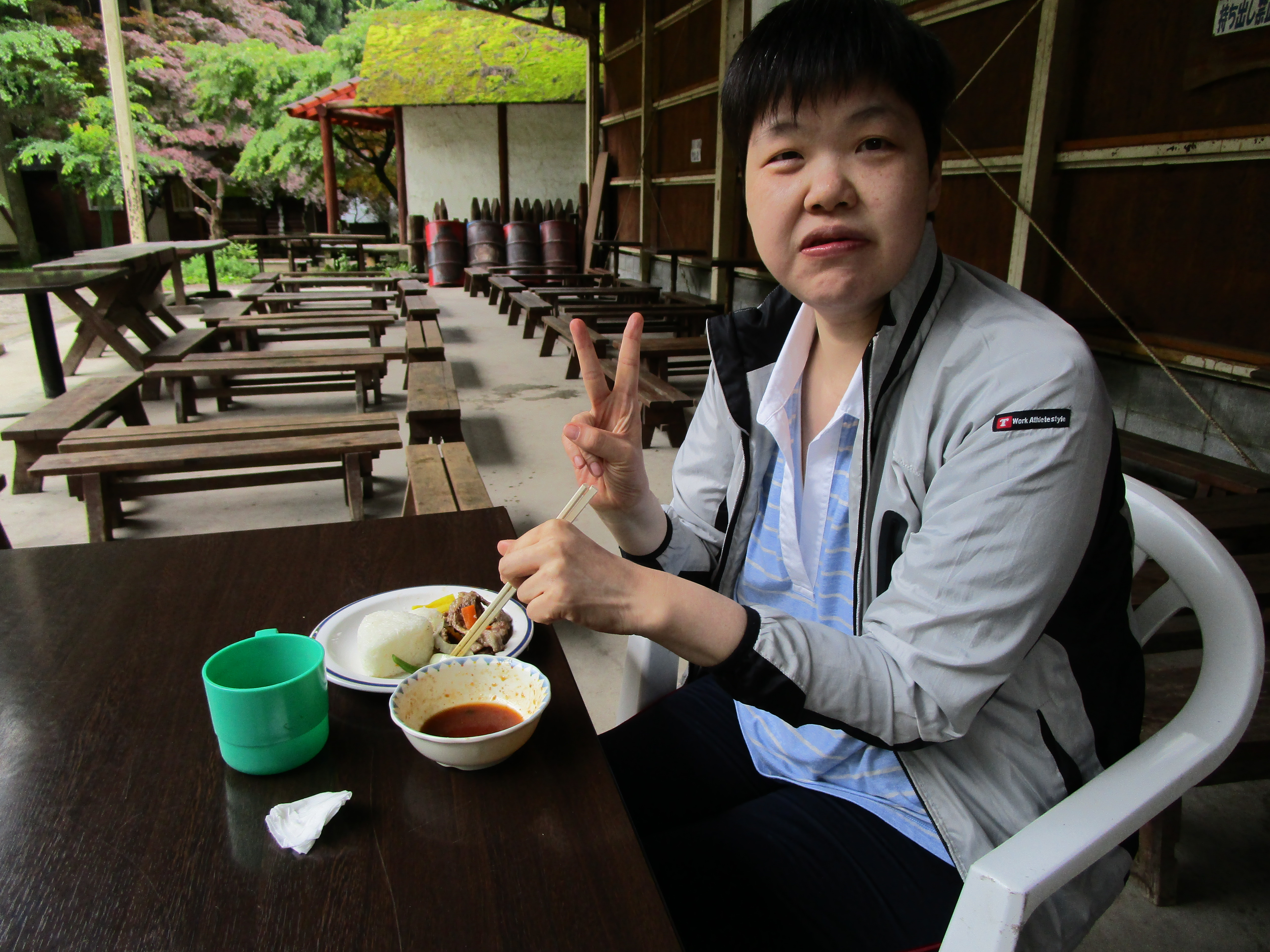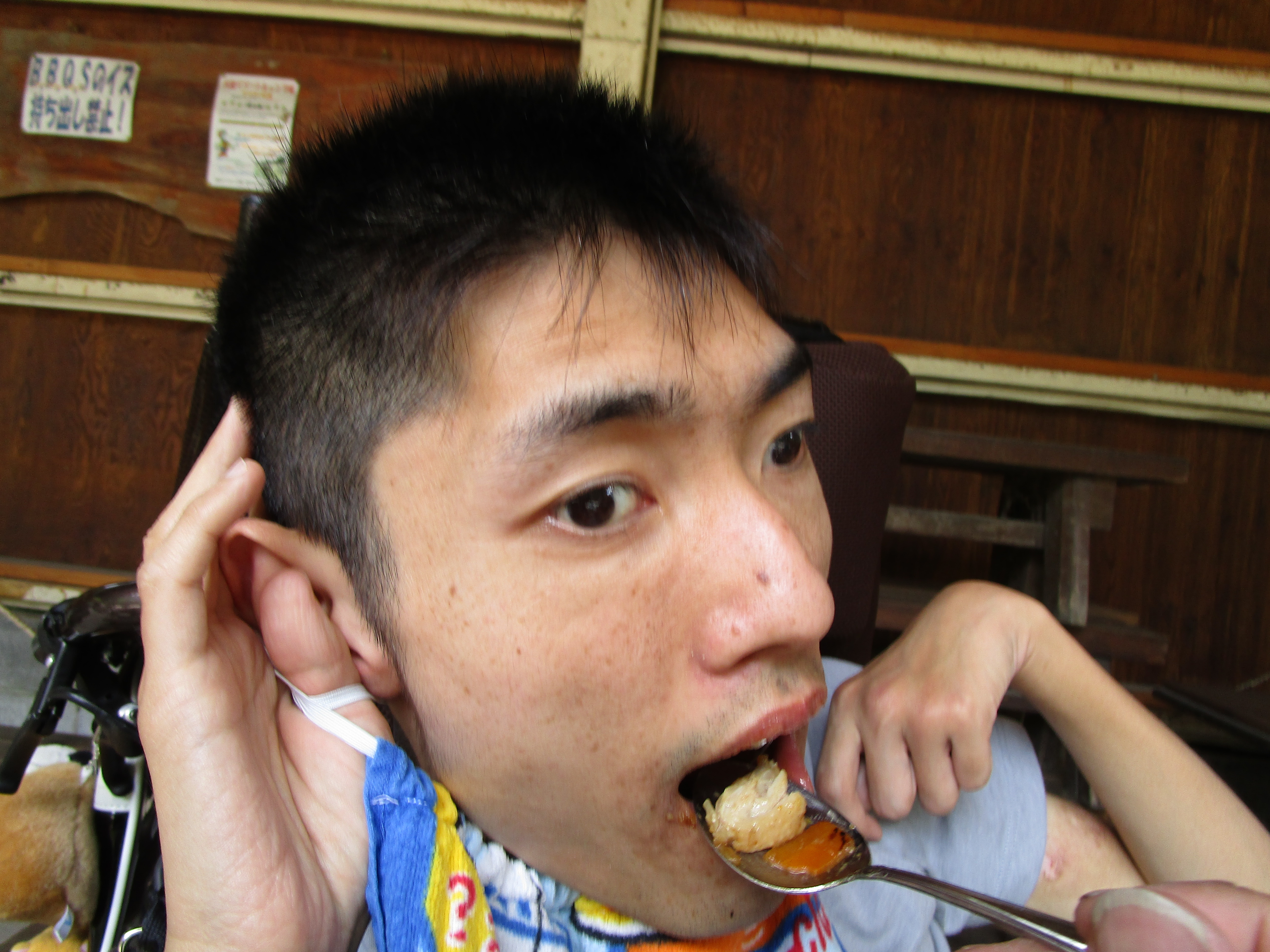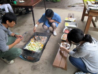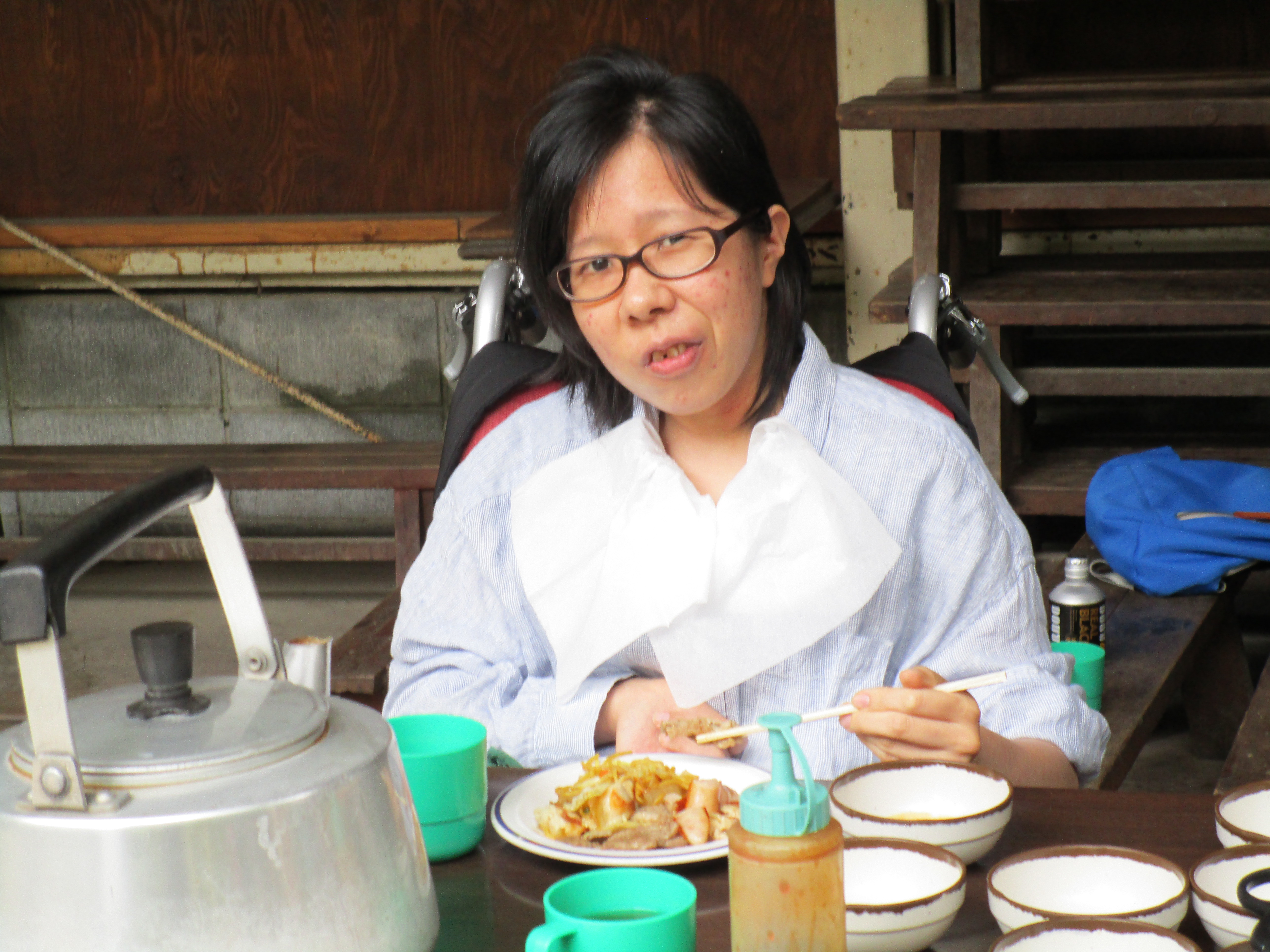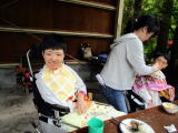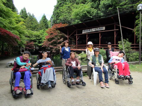 午前10時30分、伏見デイを出発。京都市内を経て、車で揺られること約70分、大森キャンプ場に到着しました。もう3〜4年間、この施設を利用しているので、キャンプ場の職員さんも手慣れた感じで、必要な用具や具材を運んでこられ、あらかじめ火を起こしてあった炭火の上に鉄板を敷き、お肉を焼きました。辺りには何とも言えない香ばしい匂いが立ち込めています。お昼時ということもあってか、否が応でもお腹が減っていることを実感してしまいました。![]() |