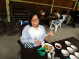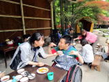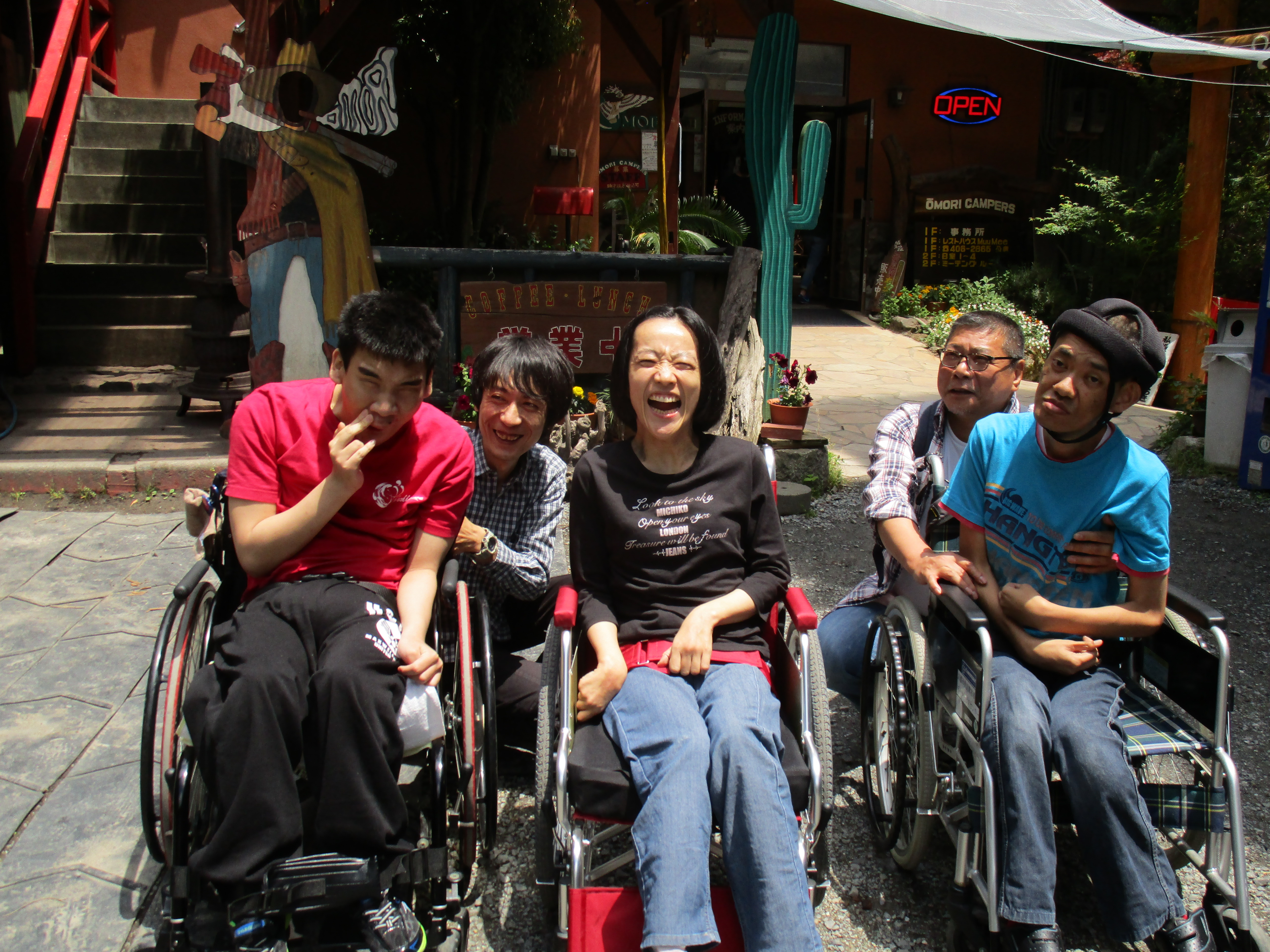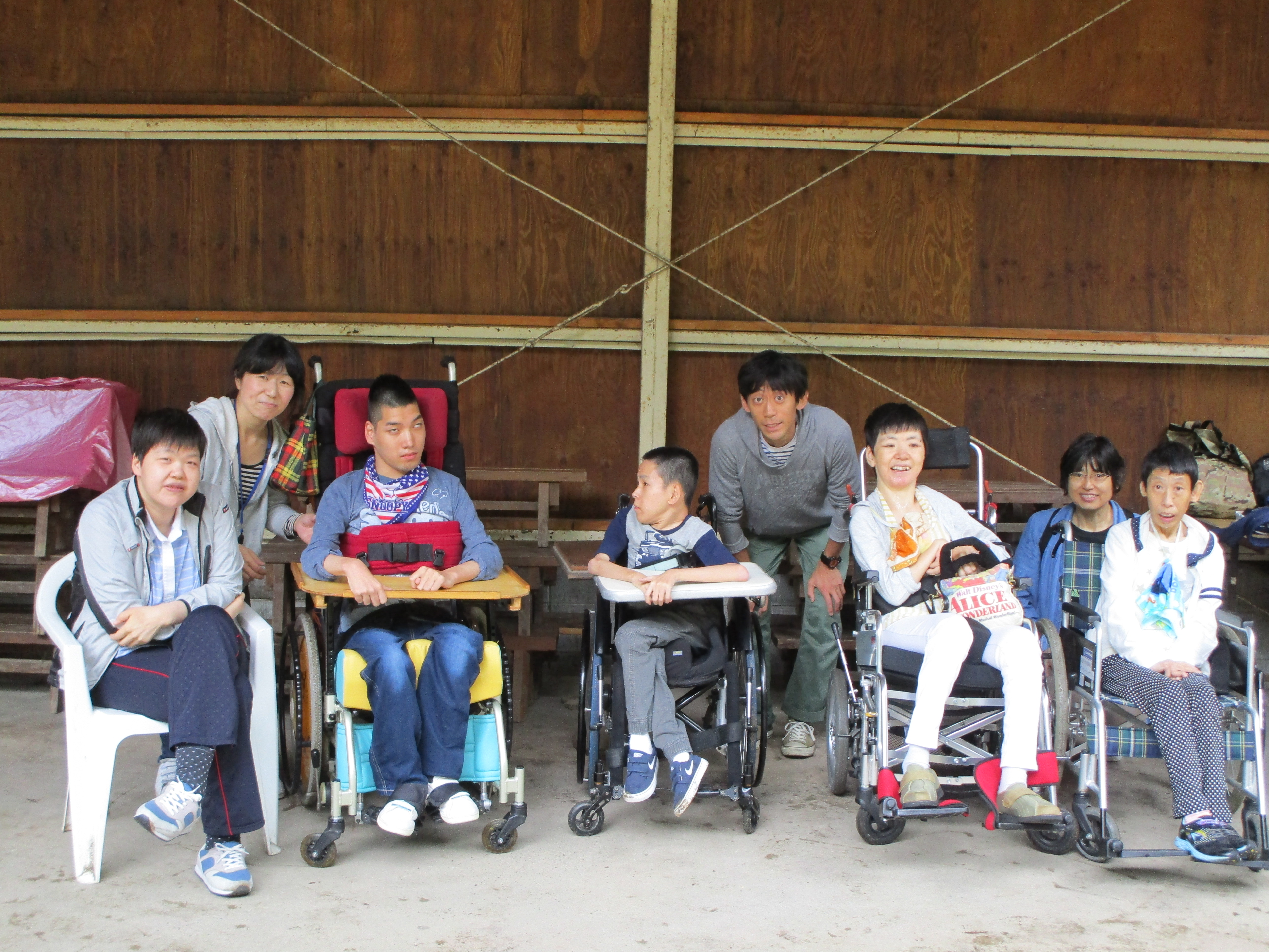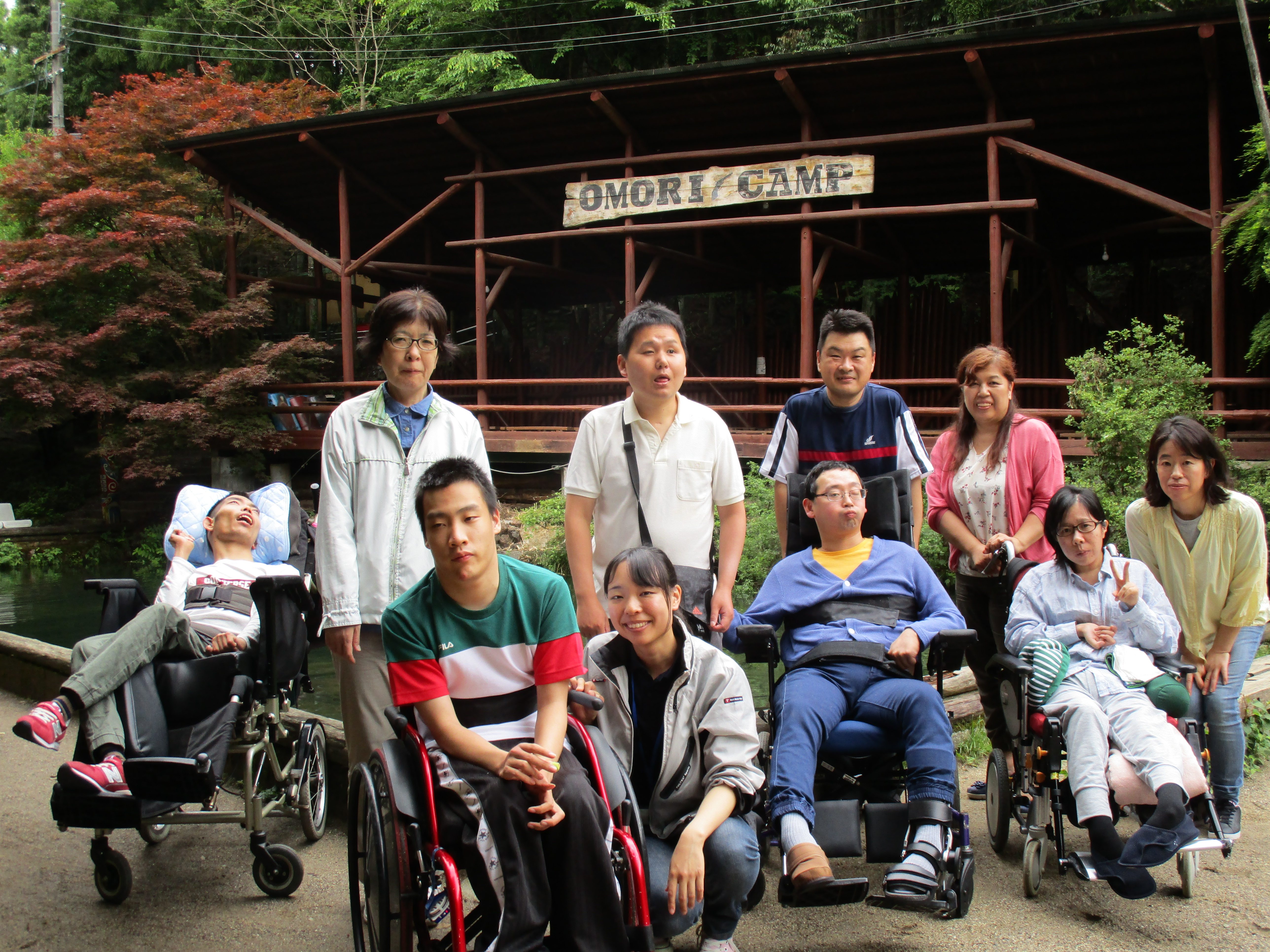 午前10時30分、伏見デイを出発。京都市内を経て、車で揺られること約70分、大森キャンプ場に到着しました。もう3〜4年間、この施設を利用しているので、キャンプ場の職員さんも手慣れた感じで、必要な用具や具材を運んでこられ、あらかじめ火を起こしてあった炭火の上に鉄板を敷き、お肉を焼きました。辺りには何とも言えない香ばしい匂いが立ち込めています。お昼時ということもあってか、否が応でもお腹が減っていることを実感してしまいました。![]() |