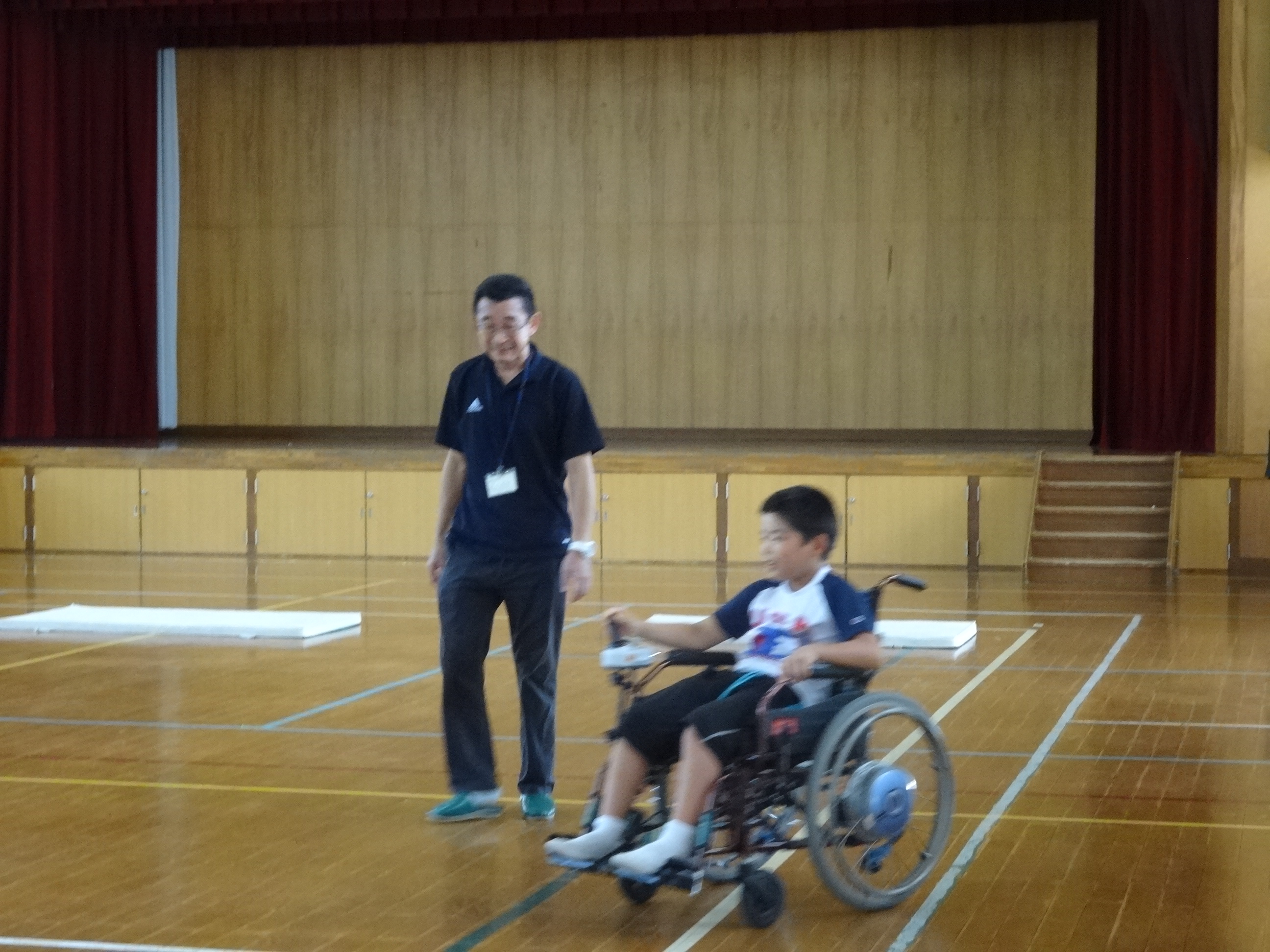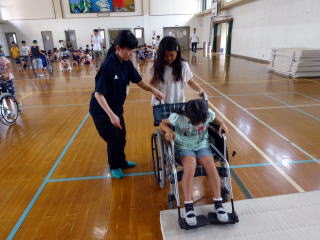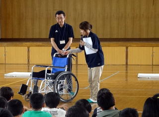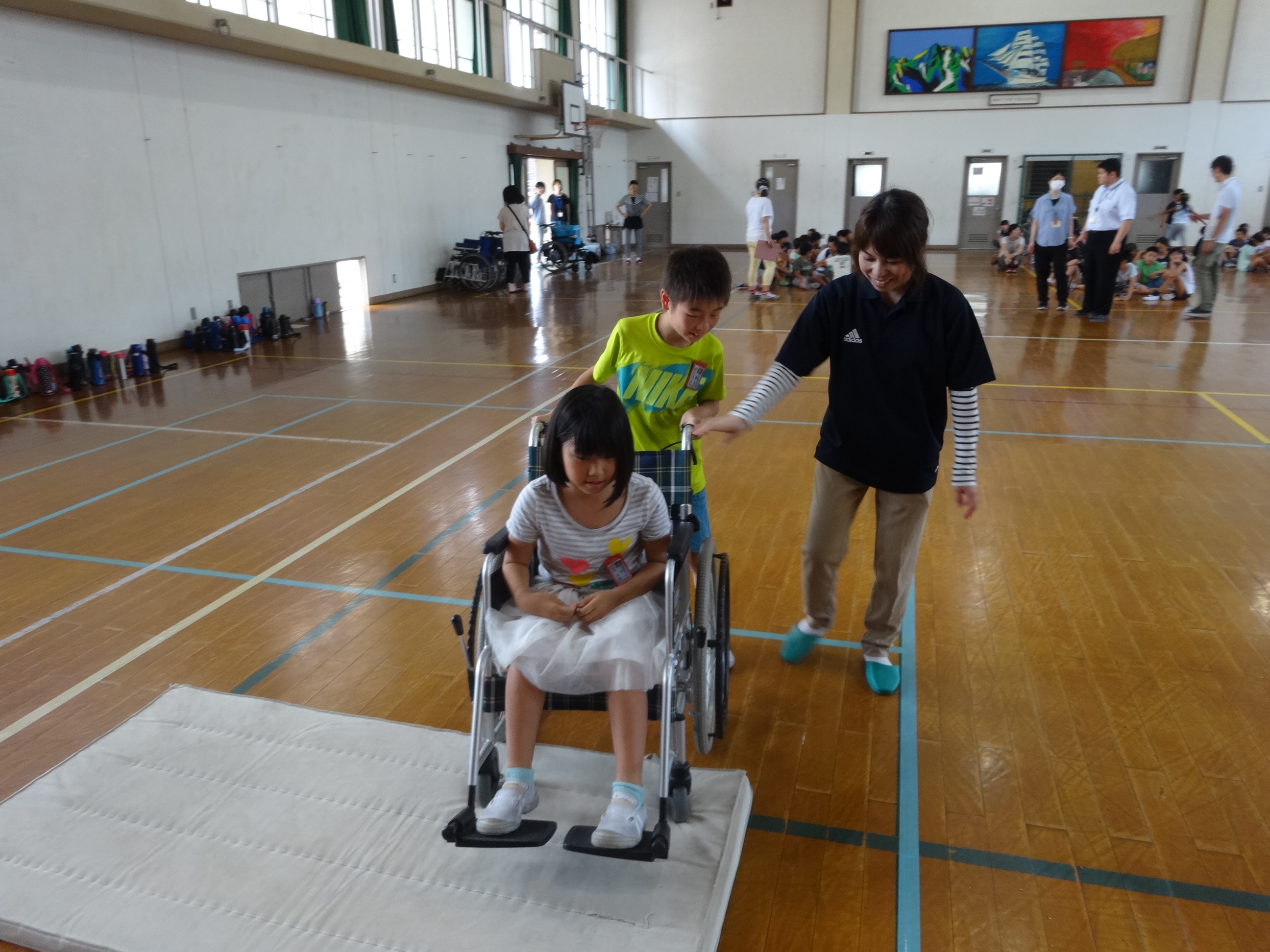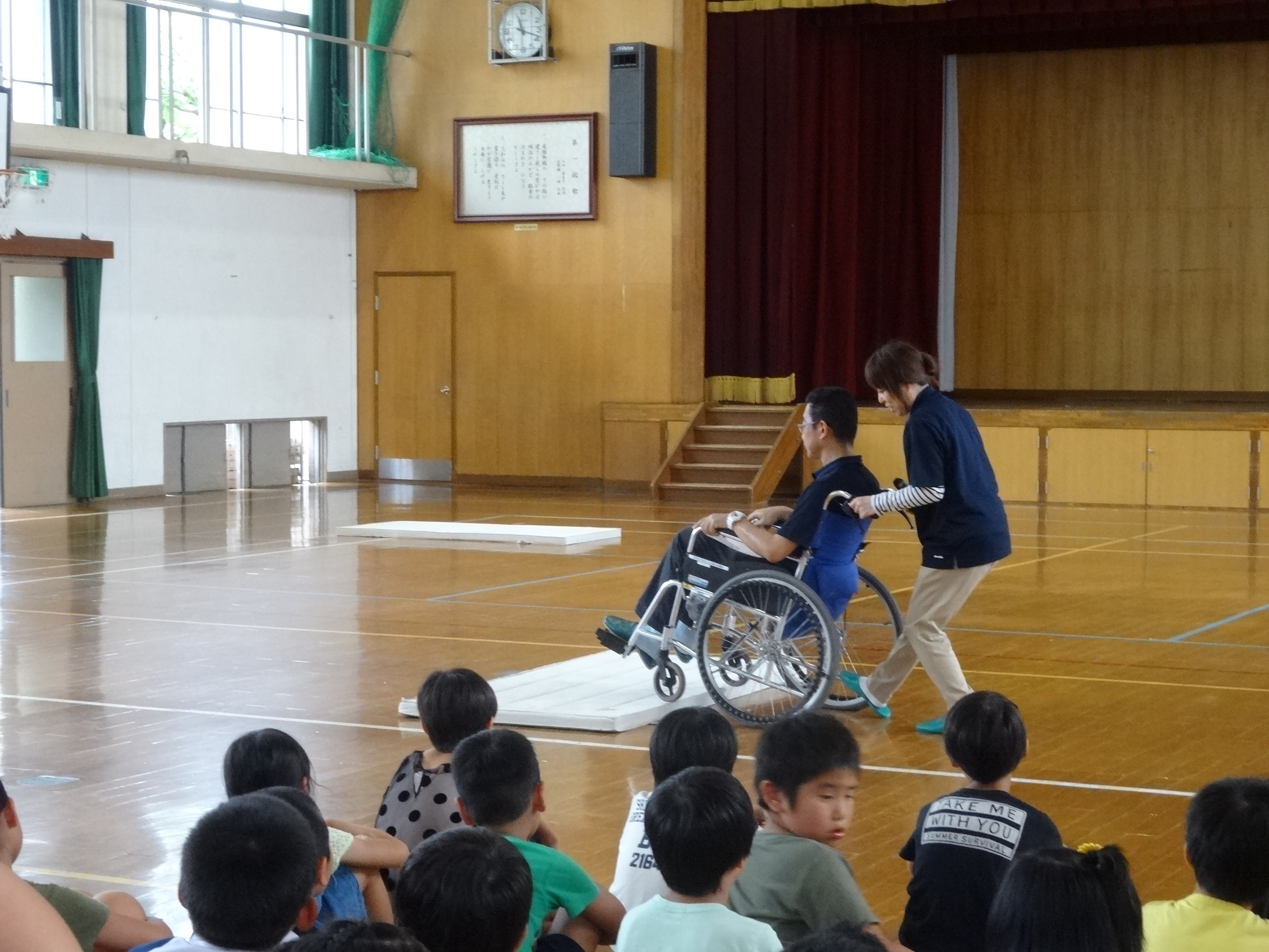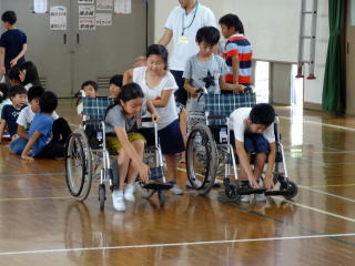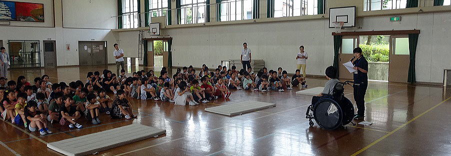 この企画は、地域公益活動の一環として開催しています。今年は、まだ梅雨が明けておらず、蒸し暑い日が続いていますが、そんな中でも板橋小学校の体育館には、たくさんの生徒さんらが集まっていました。 講習会には伏見障害者授産所のご利用者も参加されました。日ごろから車椅子を使用されている方で、外出先などで不便に感じたことや、逆に周りの方々に助けて頂いたエピソード、また今後は色々なスポーツに参加したいなど、車椅子を使用している方だからこそ感じる思いを話されていました。 |