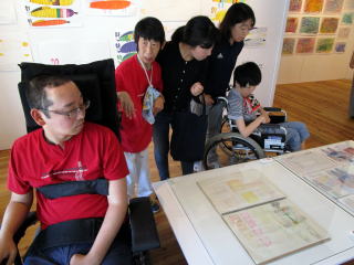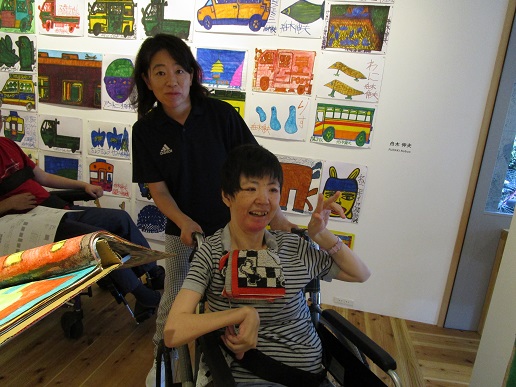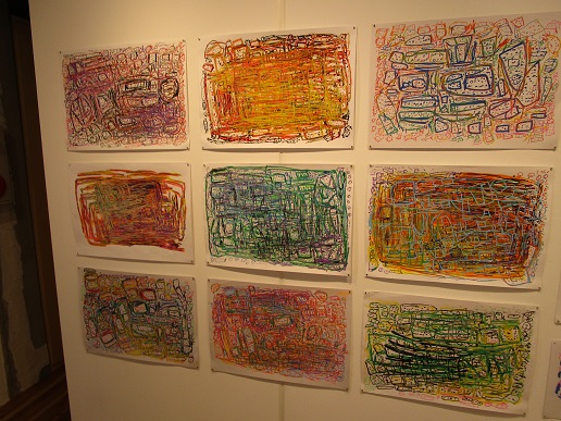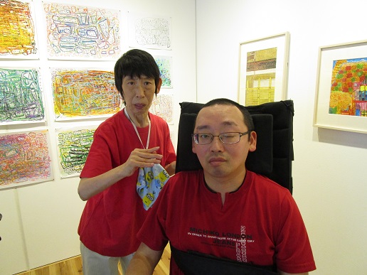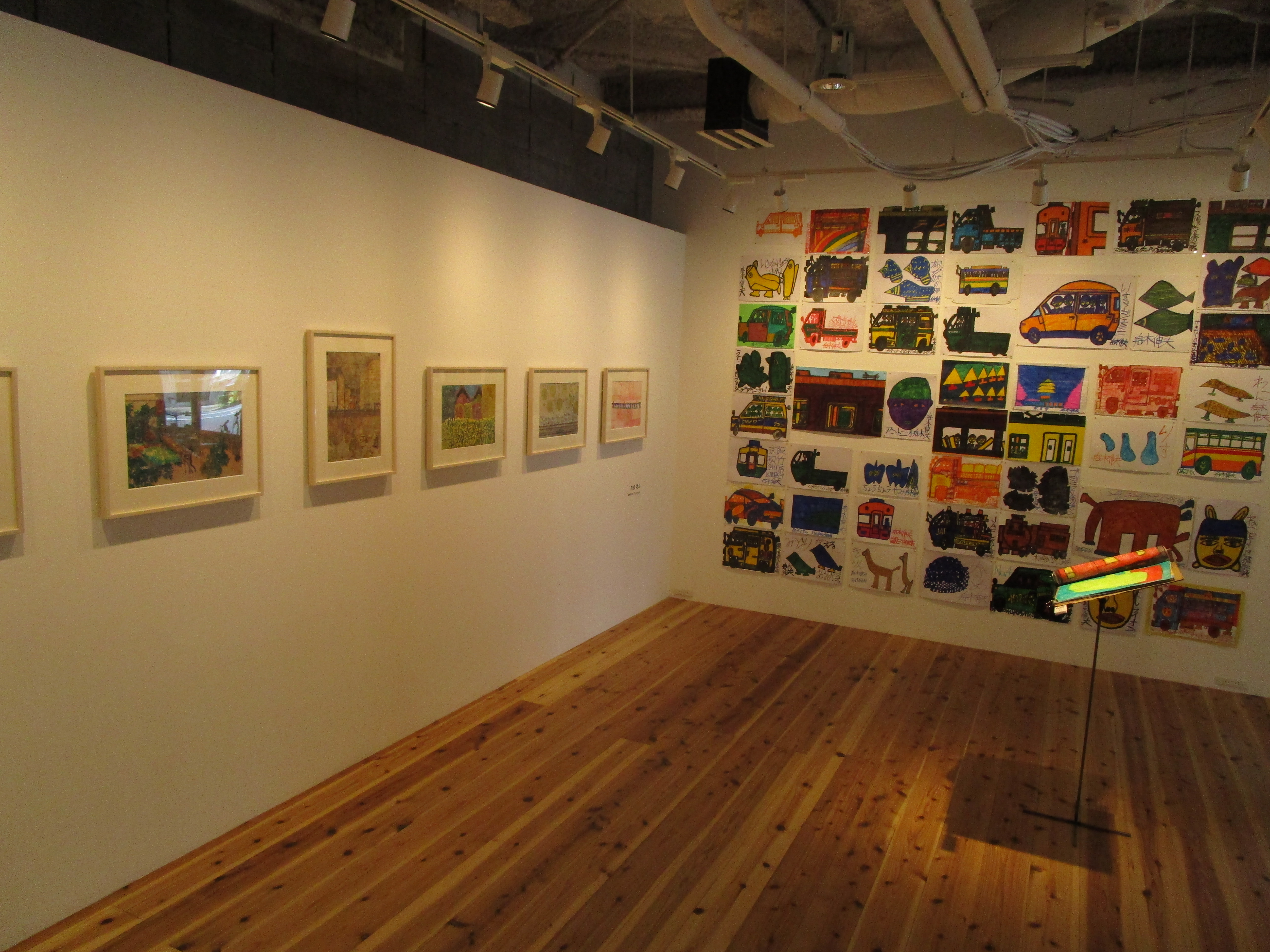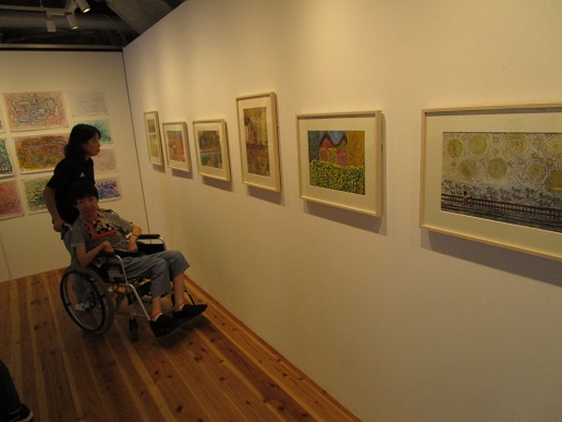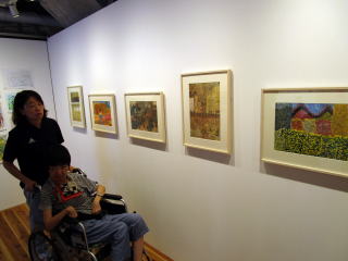 フロアにはたくさんの絵画展示されています。これら全て、障がいをお持ちの方が製作された作品だそうです。その出来栄えは、障がいの有無を感じさせることがない、どれも素晴らしい作品ばかりでした。その数々の作品の中に、当施設ご利用者の 岡 秋生