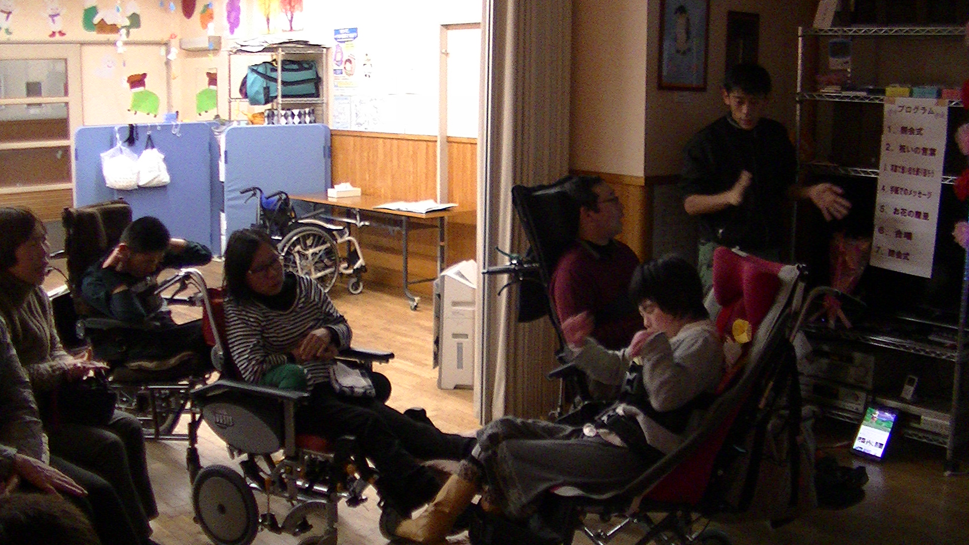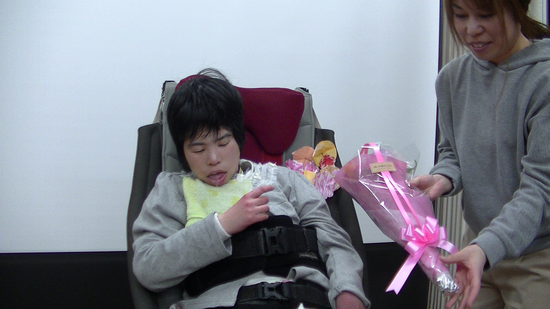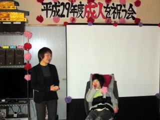 | めでたく大人の仲間入りをされたのは、藤田 早紀 様(平成28年4利用開始)で、前日は、地域の成人式にも参加されたとのこと。セレモニーでは、時任所長の挨拶をかわきりに、ご家族からお預かりした藤田様の生い立ちや、お母様からご本人に宛てた手紙などを披露しました。またデイをご利用になられてからの約2年間の活動を、スライドと共に振り返り、最初は少し緊張気味な藤田様も次第に緊張がほぐれたのか、懐かしい写真を観ながら、おもわずニッコリされる場面もありました。 | ![]() |