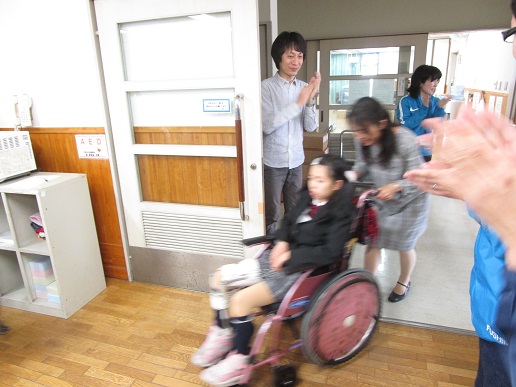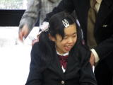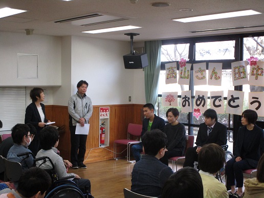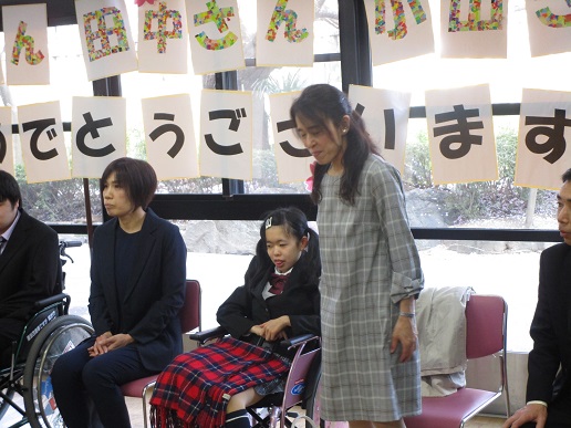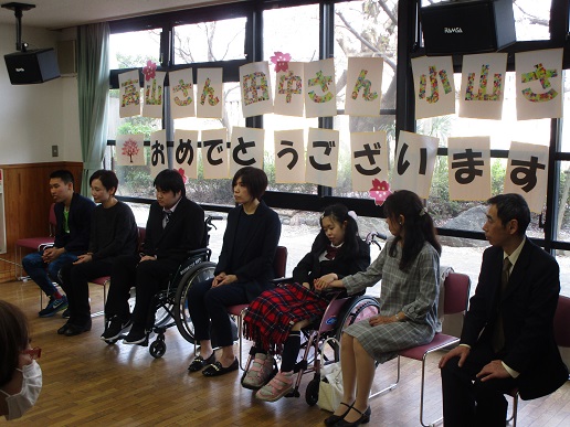 4月より、伏見デイをご利用されるのは、先月、支援学校を卒業されたばかりの 小山 芽美 様。持ち前の明るさと笑顔で、ご利用と同時にデイサービスのアイドル的存在となりました。 入所式では、ご両親も出席される中、時任所長の挨拶で始まり、続いてご利用者代表から、お祝いの挨拶がありました。 そして職員の紹介へと進み、新たにご利用となられた方とそのご家族の方からのご挨拶と、和やかな雰囲気の中で入所式が進んでいきました。 |