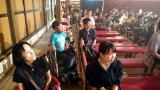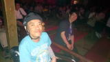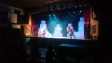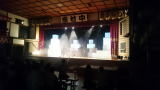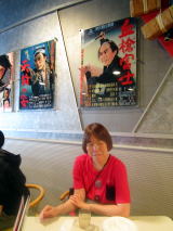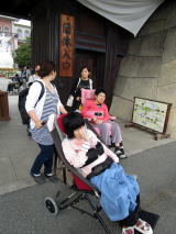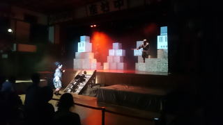 | 東映太秦映画村では忍者ショーが見られるとのことで、園内のほぼ中央にある“中村座”にやってきました。忍者ショーが始まると、冒頭から迫力のある演技で、瞬きする余裕すらない程のアクションの連続!ステージ内での演技だけでは収まらず、2階から飛び降りたり、階段を転げ落ちて、我々がいる観客席になだれ込んだりと、観客も演者も一体となったステージに大満足でした。 | ![]() |