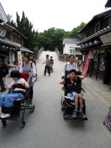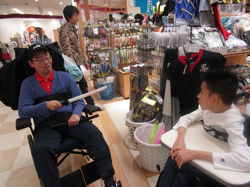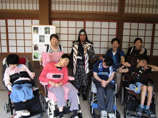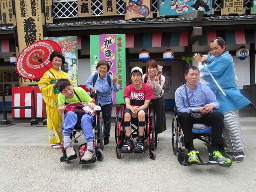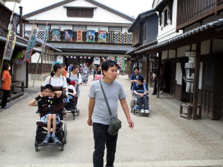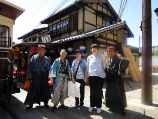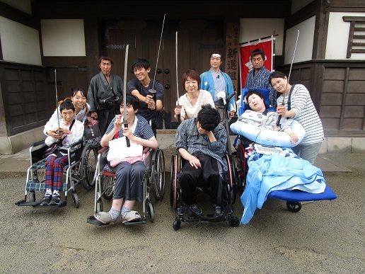 午前10時20分に施設を出発、約50分の道のりを経て、現地に到着しました。映画村には、テレビの時代劇でお馴染みの風景があり、まるで江戸時代にタイムスリップしたようでした。当時、存在した町並みや日本橋(通称:太鼓橋)も忠実に再現されており、訪れた者を魅了します。そんな町並みを散策していると、お侍さんを演じる役者さんに出会いました。ドキドキしながら一緒に記念撮影をお願いすると、快く承諾して頂き、みなさんと一緒に写真を撮りました。