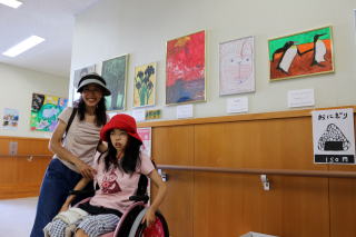 そしてデイルーム前の廊下には、ギャラリーコーナーも設置。ご利用者が創作活動で製作した作品を展示しました。回を重ねる度に良い作品に仕上がっています。今回展示した作品も、ご利用者が頑張って描き上げた力作ばかり!作品の前でご家族と記念撮影をされる方もおられました。![]() |