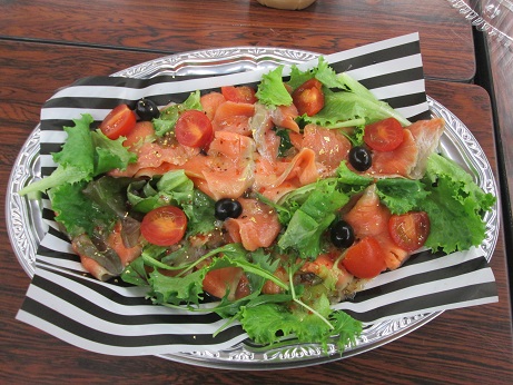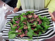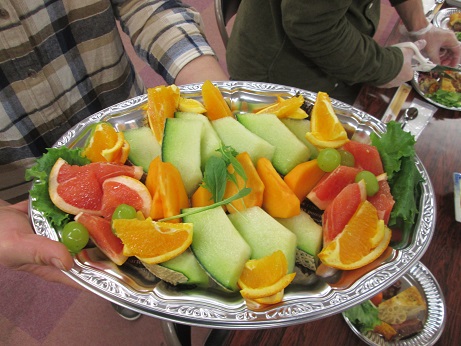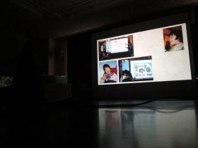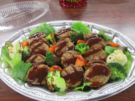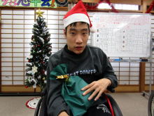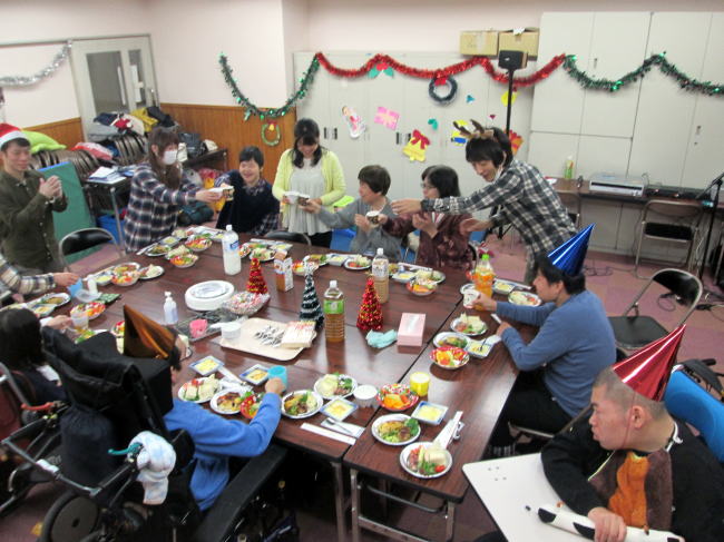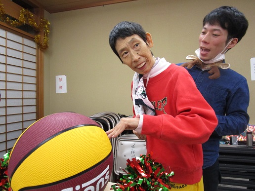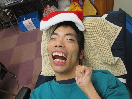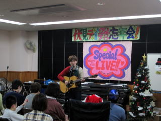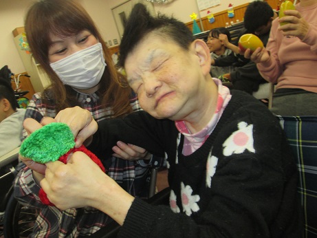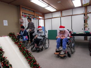 | また、ライブ鑑賞(1日目のみ)では、山口出身、大阪在住のシンガーソングライター『木下徹(きのしたてつ)』さんにお越し頂き、約40分のライブを行なって頂きました。 ライブでは木下さんの持ち歌を中心に、クリスマスソングなど、利用者さんと一緒に唄える歌も演奏され、楽器を叩いたり鳴らしたりと、演者さんと利用者さんとが一体となって大変盛り上がりました。 ライブで盛り上がった後は、デザートタイム!ティラミスを食べていると、職員が何か怪しい紐を持って、各席をまわっています。 |