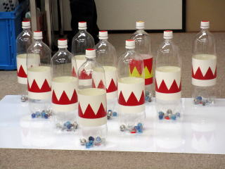 ボウリングのピンとシューターは、ボールを投げることが難しいご利用者のために、職員が仕事の合間をぬって製作。シューターの名前がLUCKY STRIKE3号!製作した職員の話によると、1号は試作で、2号は同じ法人内の某デイで活躍しているそうです。 シューターには、少しの力でストッパーが外れるような仕掛けが施されていたり、怪我をしないように丸みをつけたりと、かなりの力作!!このシューターの登場で、いままで職員が介助していた部分も、自分の力とタイミングでボールを投げることができるため、達成感を感じられるゲームとなりました。 |