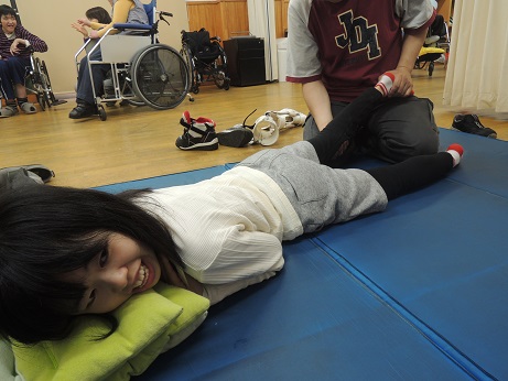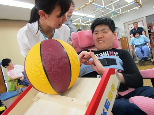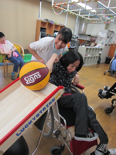 | 実習最終日には、実習生お二人のチームに分かれてプチボウリング大会! 大人数で勝負事となると、盛り上がります!! シューターの方向を利用者さんと実習生で相談して微調整するなど、一丸となって取り組んで、 ピンが倒れるとイェーイ!!と盛り上がり、皆さん楽しまれました。 |