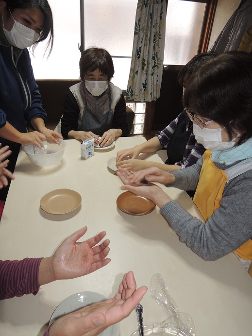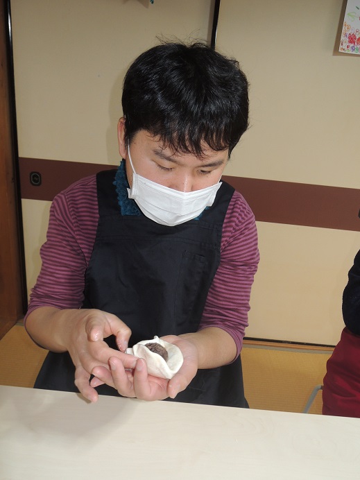 | 今回の一番難しい所、包みです。 皆さんで笑顔で話しながら、上手に包めるでしょうか?? |