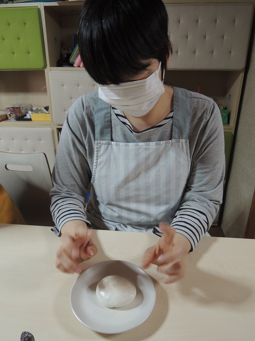 白玉粉と牛乳を分量通り量り、混ぜていきます。 さて、上手に包めるでしょうか!?